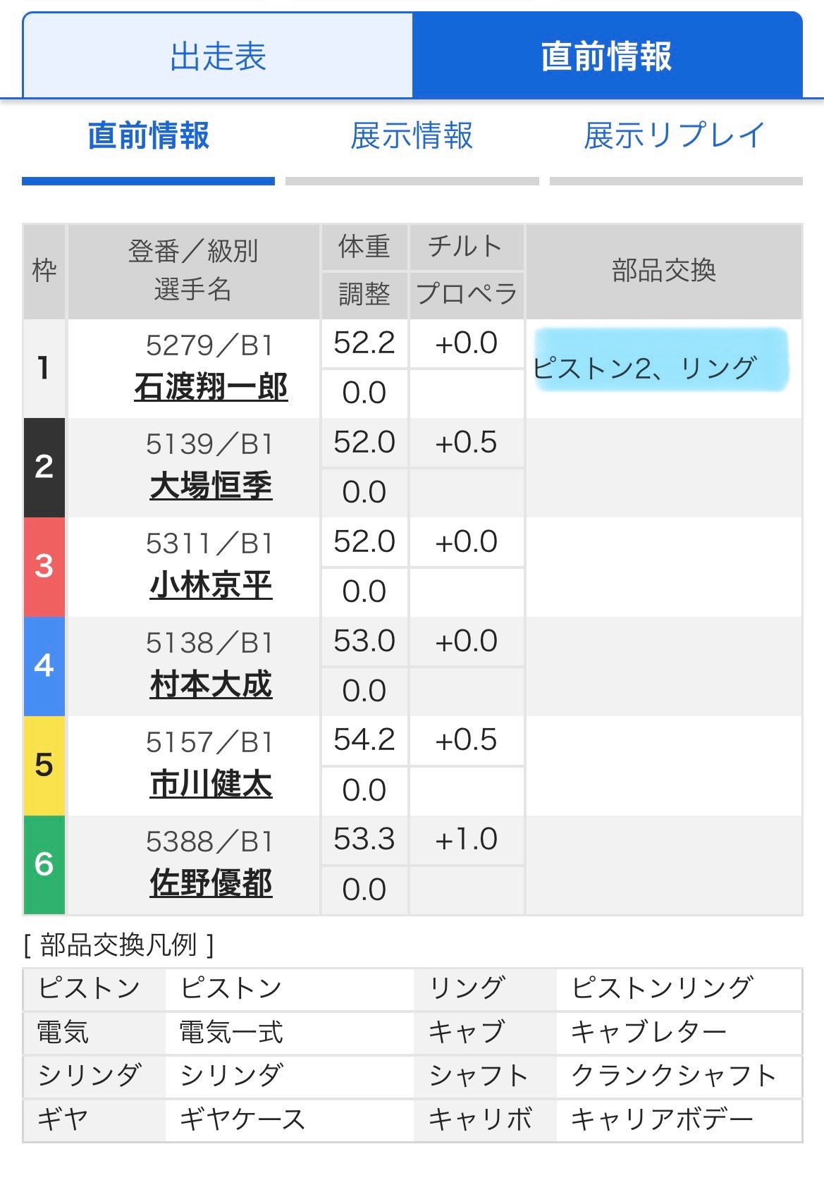 重交換は内部を総入れ替えするため新品に近くなる反面、回転の癖やパワーの出方が安定しにくい。行き足・出足・伸びのどれも仕上がっていない状態でレースに臨むことが多く、スタート遅れや直線での伸び負けにつながる。特に初日は不安定さが顕著で、舟券的には見送りが基本となる。